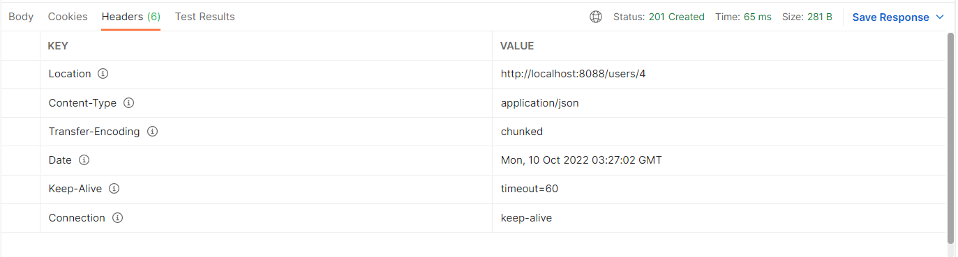 사용자에게 특정한 URI를 전달할때 ServletUriComponentsBuilder 클래스를 사용한다. ServletUriComponentsBuilder 반환값은 URI로 받고, 컨트롤러에서 반환 타입은 ResponseEntity로 한다. @PostMapping("/users"..