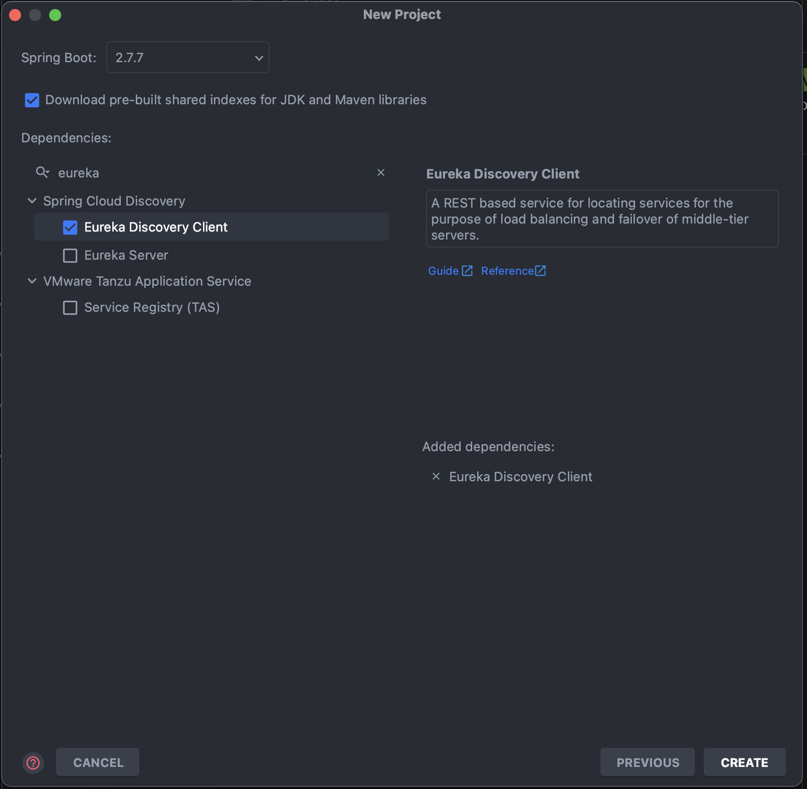 - dependency : Eureka Discovery Client, Spring Web 추가 (Spring Web 없으면 Run 실행 시 에러 발생)