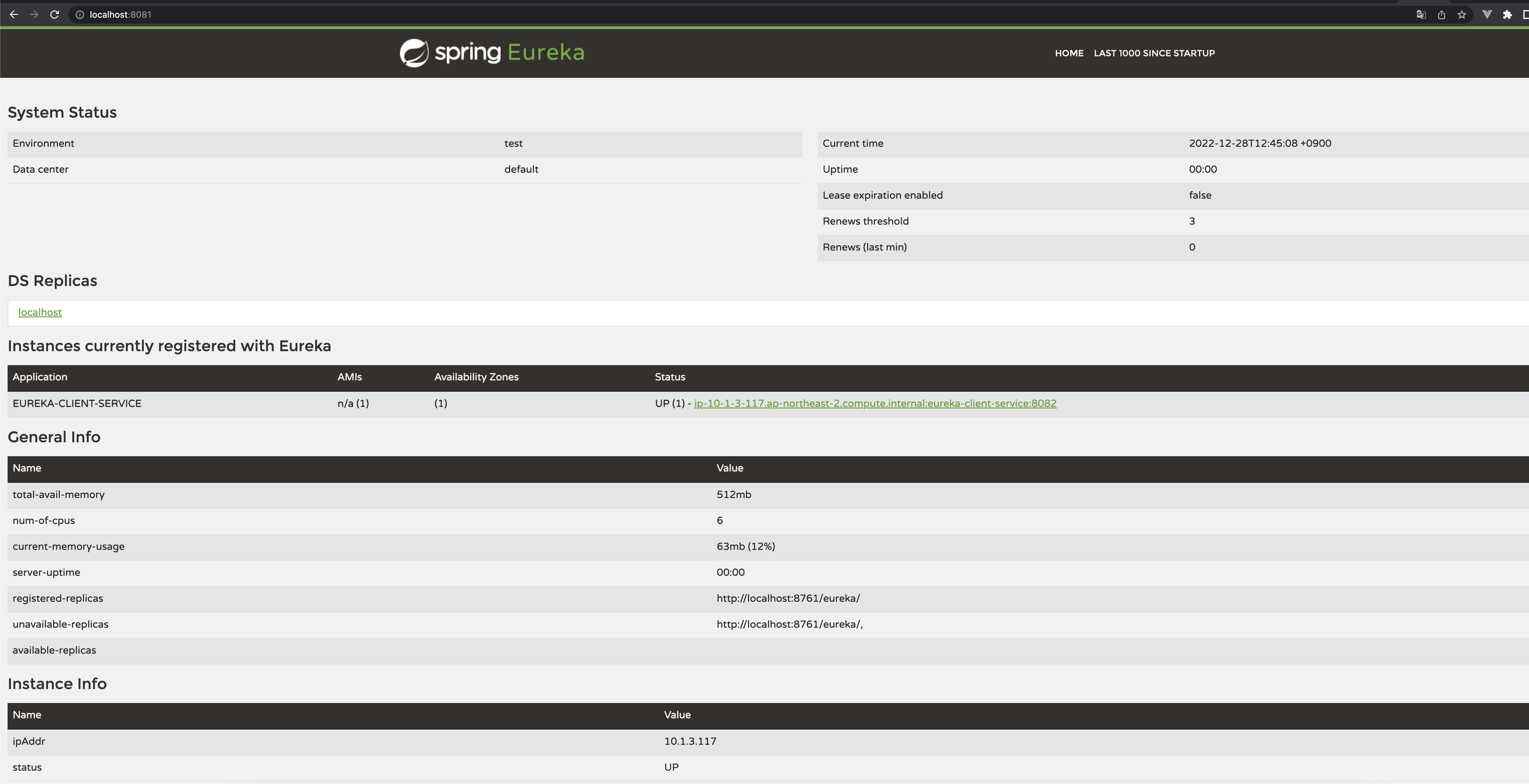 Instances cirurrently registered with Eureka 부분을 보면 등록된 eureka-client-service:8082 를 확인할 수 있다.